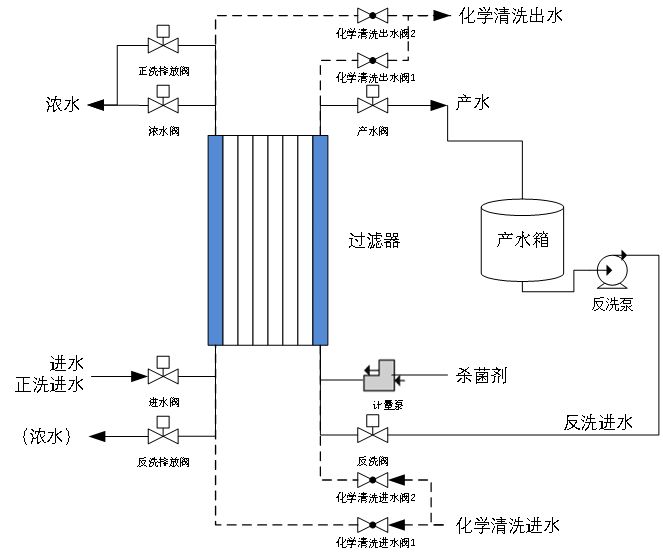 用于膜法水處理設備的前端預處理,為壓力驅動式過濾,可有效截留懸浮物、膠體、大分子有機物等雜質。